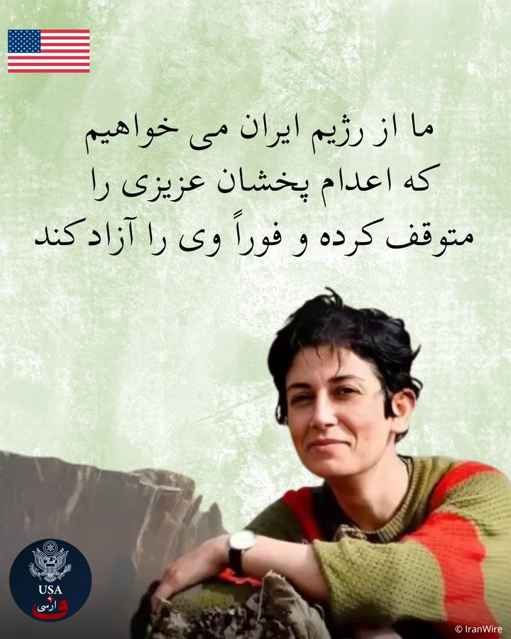 وزارت خارجه آمریکا همچنین از جمهوری اسلامی خواست ضمن توقف فوری اجرای حکم اعدام پخشان عزیزی، همه زندانیان سیاسی را آزاد کرده و به «کارزار ترور علیه مردم خود» پایان دهد.