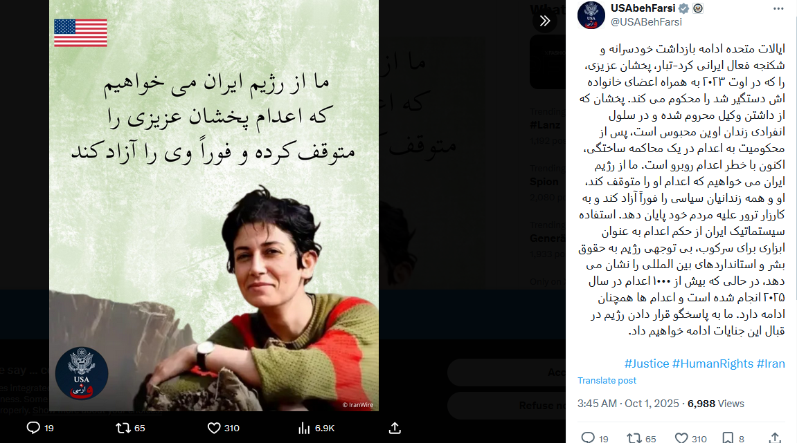 ایالات متحده با محکوم کردن استفاده جمهوری اسلامی از اعدام به عنوان ابزاری برای سرکوب سیاسی، اعلام کرد: «بیش از یکهزار اعدام در سال ۲۰۲۵ در ایران انجام شده و این روند همچنان ادامه دارد. ما به پاسخگو قرار دادن رژیم در قبال این جنایات ادامه خواهیم داد.»