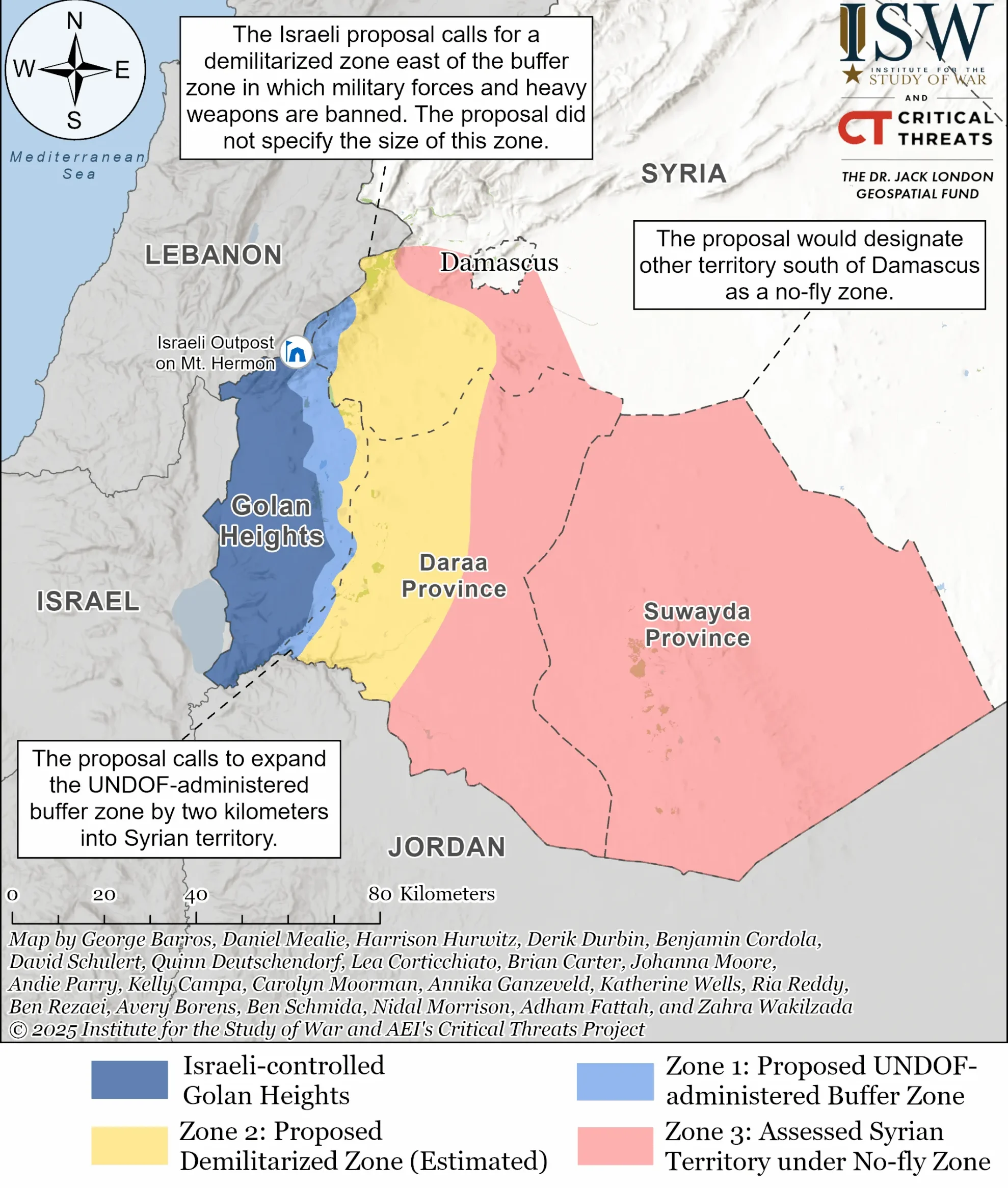 مؤسسه آمریکایی مطالعات جنگ (ISW) نقشهای از ترتیبات امنیتی پیشنهادی در جنوب سوریه منتشر کرده است؛ همزمان، رسانههای اسرائیلی و غربی از نزدیک بودن توافق امنیتی میان دمشق و تلآویو خبر میدهند.